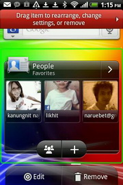 - ตรงกลางหน้าจอแสดงผล เป็นพื้นที่แสดงภาพพื้นหลัง และจัดวางไอคอนทางลัดต่างๆ เพื่อการเข้าถึงแอพพลิเคชั่นได้ทันทีผ่านหน้าจอหลัก ซึ่งค่าเริ่มต้นมีวิดเจ็ตจัดวางมาให้แต่ละหน้าเรียงลำดับดังนี้ นัดหมาย, ข้อความ, Friend Stream, ทางลัด และนาฬิกา, Google Search และรายชื่อ, ดนตรี