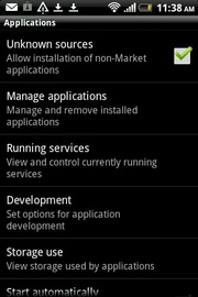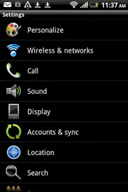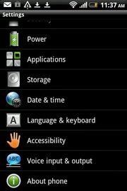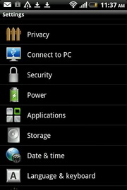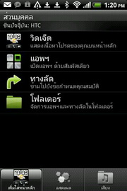 Settings - ส่วนการตั้งค่าต่างๆ ของโทรศัพท์ ได้แก่ ส่วนบุคคล, ไร้สาย & เครือข่าย, โทร, เสียง, หน้าจอ, บัญชีและการซิงค์, ตำแหน่ง, ค้นหา, ความเป็นส่วนตัว, เชื่อมต่อไปพีซี, ความปลอดภัย, พาวเวอร์, แอพพลิเคชั่น, หน่วยความจำ, วัน & เวลา, ภาษา & แป้นพิมพ์, การเข้าถึง, เสียงที่เข้า & เสียงที่ออก, เกี่ยวกับโทรศัพท์