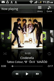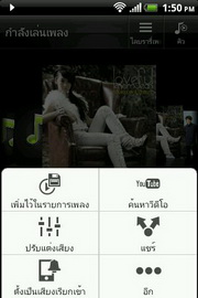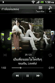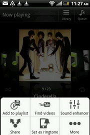 โปรแกรมเล่นเพลง มีโหมดเล่นเพลงแบบสุ่ม, วนซ้ำ ปรับแต่งเสียงแบบเพิ่มเสียงเซอร์ราวด์, อีควอไลเซอร์ (เมื่อใช้หูฟังเท่านั้น) ได้แก่ เพิ่มเสียงทุ้ม, เพิ่มเสียงแหลม, เพิ่มเสียงร้อง, บูลส์, คลาสสิค, คันทรี่, แจ๊ส, ละติน, นิวเอจ, เปียโน, ป๊อป, อาร์แอนด์บี, ร็อค พร้อมเครื่องมือค้นหาวีดีโอใน YouTube จากเพลงที่กำลังรับฟังอยู่, ตั้งเป็นเสียงเรียกเข้า และแบ่งปันทางช่องทาง Gmail, ข้อความ, บลูทูธ และอีเมล