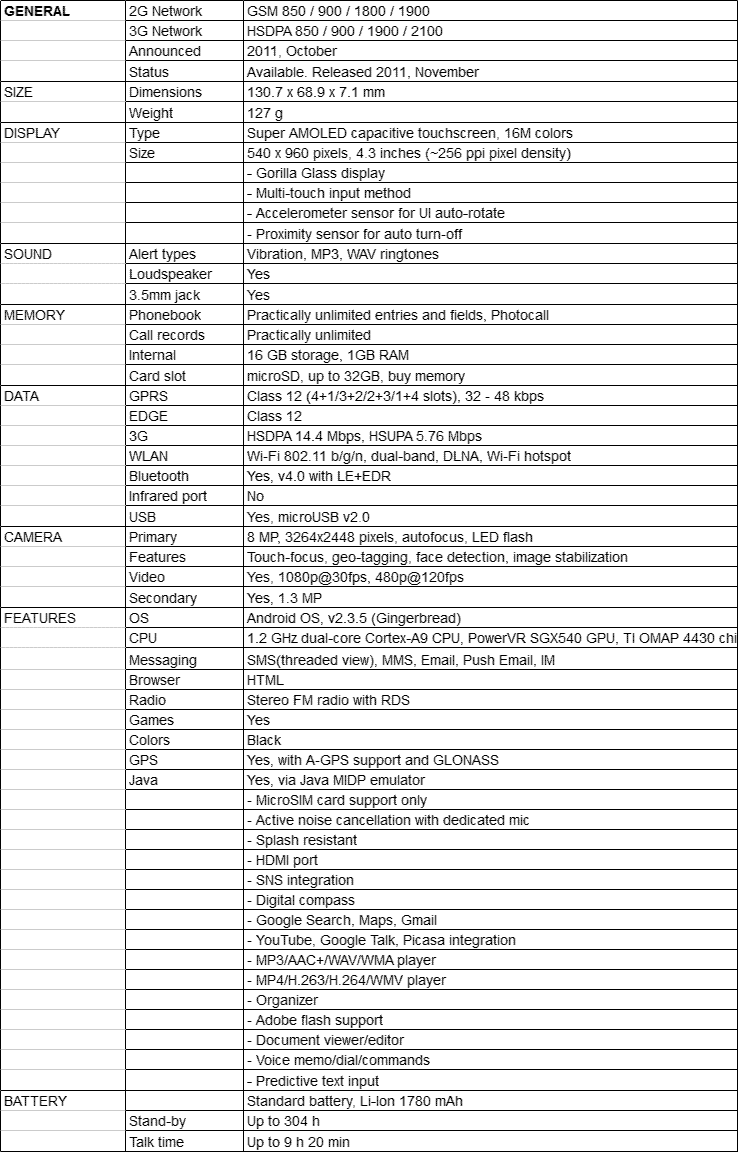หน้าจอแสดงผลกว้างขนาด 4.3 นิ้ว (10.9 ซม.) ใช้หลอดภาพ Super AMOLED ให้สีได้มากสุด 16 ล้านสี ความละเอียดหน้าจอ 540 x 960 พิกเซล ปกป้องหน้าจอด้วยกระจก Corning Gorilla Glass ป้องกันการเกาะติดของฝุ่น และหยดน้ำ