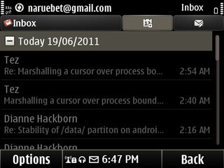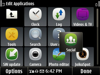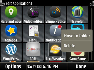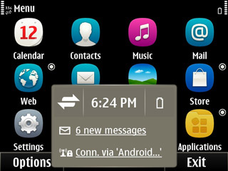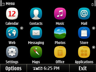เลือกที่ Menu จะปรากฏหน้าจอแอพพลิเคชั่นของ Nokia E6 ขึ้นมาดังภาพ ในหน้า Menu นั้น การแจ้งเตือนจะถูกย้ายมาแสดงอยู่ด้านล่าง และเมื่อแตะก็จะแสดงรายละเอียดต่างๆ เช่นเดียวกัน หน้า Menu เปลียบเสมือนหน้าหลัก หรือ หน้าหมวดหมู่ ของแอพพลิเคชั่น ซึ่งแอพพลิเคชั่นต่างๆ ที่ผู้ใช้ดาวน์โหลดเพิ่มนั้นจะสามารถเรียกใช้ได้จากหมวด Applications