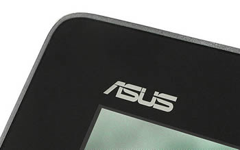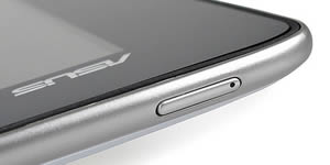 เหนือหน้าจอขึ้นไปในมุมมองแนวนอน มีเลนส์กล้องหน้าวางคู่กับเซ็นเซอร์ตรวจจับแสงสว่าง และมีโลโก้ ASUS วางอยู่มุมซ้ายบน