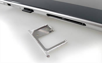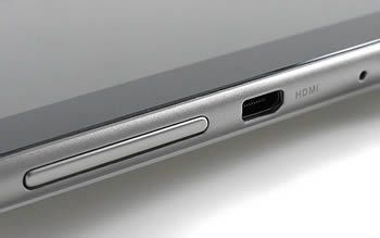 ด้านซ้ายตัวเครื่องมีปุ่มปรับระดับเสียง, ช่องต่อ micro HDMI, ช่องไมโครโฟน, ช่องเสียบ microSD การ์ด และถาดใส่ซิมพร้อมฝาปิด ซึ่งต้องใช้อุปกรณ์ปลายแหลมเล็ก กดเข้าไปที่รูด้านขวาเพื่อให้ถาดเลื่อนออกมาถึงจะใส่ซิมได้ ซึ่งภายในมีการจัดวางซิมในแนวนอน