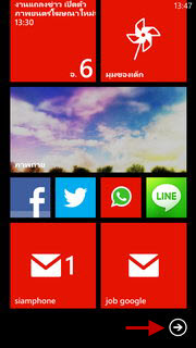 เลื่อนมาด้านล่างสุดจะพบกับไอคอนลูกศรชี้ไปด้านขวา คือไอคอนทางเข้าหน้าแอพพลิเคชั่น หรือปัดนิ้วบนหน้าจอหลักไปทางซ้ายก็สามารถเข้าสู่หน้าแอพพลิเคชั่นได้