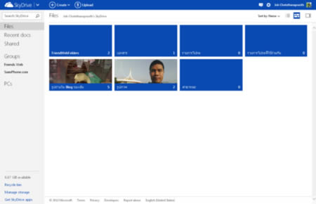ตัวอย่างการใช้งานโปรแกรม SkyDrive ผ่านเครื่องพีซี แกลเลอรี่ รวมไฟล์ภาพและรูปถ่ายจากกล้องที่อยู่ในโทรศัพท์ทั้งหมด โดยแบ่งออกเป็น 4 หน้า ได้แก่ การแบ่งไฟล์ (ม้วนฟิล์ม, อัลบั้ม, วันที่, ผู้คน), รายการโปรด, มีอะไรใหม่, แอพฯ
