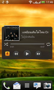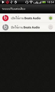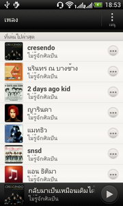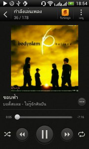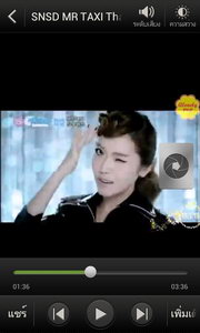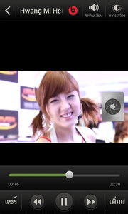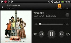 ภายในเครื่องเล่นเพลง มีปุ่มเล่นเพลง/หยุดเพลง, ย้อนไปเพลงก่อน, ข้ามไปเพลงถัดไป, สลับเพลง, เล่นซ้ำ, ไอคอนทางลัดเรียกใช้งาน SoundHound, ปุ่มเมนูเพลงเพิ่มเติม (รายละเอียดอัลบั้ม, เพิ่มไว้ในรายการเพลง, แชร์, ตั้งเป็นเสียงเรียกเข้า, ค้นหา) มีเมนูเพิ่มเติมอีกอันอยู่ด้านขวาบน (คิว, อัพเดทรูปปกอัลบั้ม, ปรับแต่งเสียง (เปิด/ปิดใช้งาน Beats Audio), รายละเอียด)