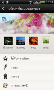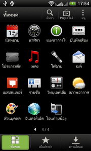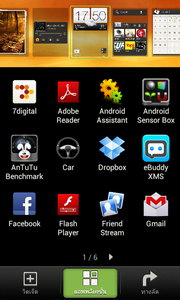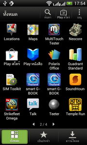 หน้าแอพพลิเคชั่น ไอคอนแอพพลิเคชั่นทั้งหมดในเครื่องถูกจัดเรียงอยู่ในรูปแบบ 4x4 แถว เลื่อนนิ้วไปทางซ้าย/ขวา เพื่อดูหน้าแอพพลิเคชั่นอื่นๆ ได้ ด้านบนเป็นชื่อประเภทไอคอน และเครื่องมือค้นหาไอคอน, ดาวน์โหลดแอพพลิเคชั่นผ่าน Play Store, และเมนูเพิ่มเติม (เรียง, แบ่งปัน, จัดการแอพฯ, แก้ไขแถบแสดงผลรูปแบบการเรียงแอพพลิเคชั่น