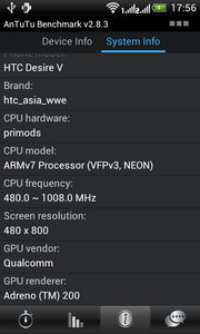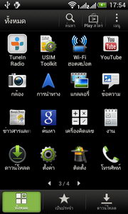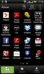 ด้านล่างเป็นเมนูแสดงรูปแบบการจัดเรียงแอพพลิเคชั่น แบ่งออกเป็น ทั้งหมด (All), ใช้บ่อย (Frequent), ดาวน์โหลด (Downloads) ข้อมูลทางด้านฮาร์ดแวร์ HTC Desire V รันบนระบบปฏิบัติการแอนดรอยด์ 4.0.3 Ice Cream Sandwich ครอบทับด้วย HTC Sense 4 ขับเคลื่อนด้วย CPU ความเร็ว 1 GHz ARMv7 Processor (VFPv3, NEON), GPU Qualcomm Adreno ™ 200, RAM 512 MB, พื้นที่เก็บข้อมูลในเครื่องทั้งหมด 4 GB, รองรับการใช้งานสองซิม, 3G, Wi-Fi, Wi-Fi Hotspot, Wi-Fi Direct, Bluetooth 4.0, EDGE/GPRS, หน่วยความจำภายนอก microSD การ์ดสูงสุด 32 GB, พร้อมระบบเสียง Beats Audio