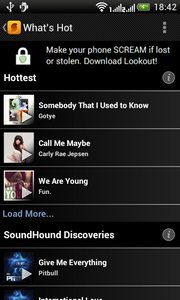 SoundHound เครื่องมือค้นหาเพลงที่กำลังฟังอยู่ พร้อมแสดงรายละเอียดเพลง, ศิลปิน, ความนิยม (เฉพาะเพลงสากล, เกาหลี, ญี่ปุ่น) พร้อมทั้งแนะนำเพลงฮิตติดชาร์จล่าสุดให้ผู้ใช้ได้ทดลองฟัง