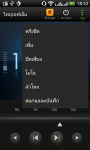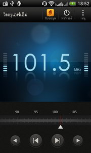 เครื่องเล่นวิทยุ FM มีระบบสแกนหาคลื่นวิทยุอัตโนมัติ ภายในเครื่องเล่นวิทยุมีปุ่มย้อนไปคลื่นก่อนหน้า, ข้ามไปคลื่นถัดไป, แถบคลื่นวิทยุ และปุ่มลัดใช้งาน SoundHound, ปุ่มปิดวิทยุ และเมนูเพิ่มเติม (พรีเซ็ต, เพิ่ม, ปิดเสียง, โมโน, ลำโพง, สนทนาและบันทึก)