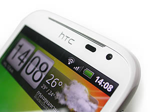 ด้านหน้า ส่วนบนมีลำโพงเสียงสนทนา ถัดลงมาทางซ้ายซ่อนไฟแสดงสถานะไว้ข้างๆ โลโก้ htc ถัดมามี Sensor Proximity เปิด/ปิดหน้าจอ, เซ็นเซอร์ปรับความสว่างอัตโนมัติ และเลนส์กล้องหน้า ความละเอียด 1.3 ล้านพิกเซล