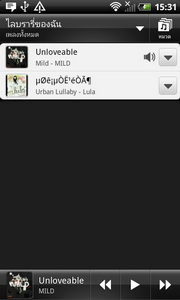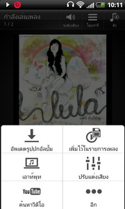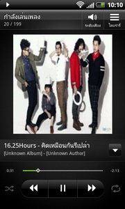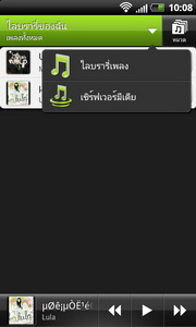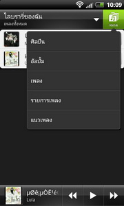 โปรแกรมเล่นเพลง สามารถเลือกเล่นไฟล์เพลงได้จากไลบรารี่เพลง (ที่เก็บข้อมูลในโทรศัพท์) และเล่นไฟล์จากเซิร์ฟเวอร์มีเดีย ผ่านเครือข่าย Wi-Fi หากเปิดจากไลบรารี่เพลงในเครื่องจะสามารถเลือกรายการเพลงตามการจัดกลุ่มชื่อศิลปิน, อัลบั้ม, เพลง, รายการเพลง และแนวเพลง หน้าตาเครื่องเล่นเพลงสามารถเลือกแสดงได้ทั้งแบบคิวเพลงที่แสดงเป็นรายการเพลง หรือเครื่องเล่นเพลงที่แสดงหน้าปกอัลบั้ม (ถ้ามี) ขนาดใหญ่ พร้อมไอคอนเครื่องมือควบคุมการเล่นเพลง พร้อมปรับเปลี่ยนมุมมองตามการวางเครื่องในแนวนอน และแนวตั้งอัตโนมัติ