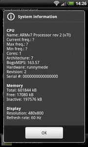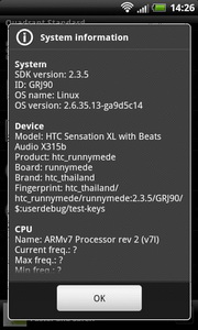 HTC Sensation XL ทำงานบนระบบปฏิบัติการแอนดรอยด์ 2.3.5 ใช้หน่วยประมวลผล ARMv7 Processor rev 2 (v7l) ความเร็ว 1.5 GHz, GPU Adreno 205, RAM 768 MB, หน่วยความจำภายใน 16 GB