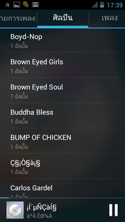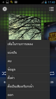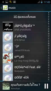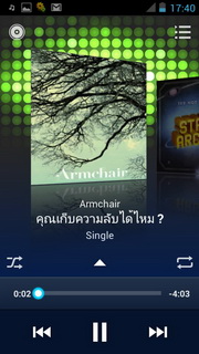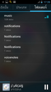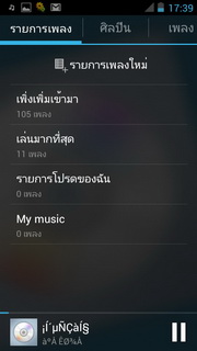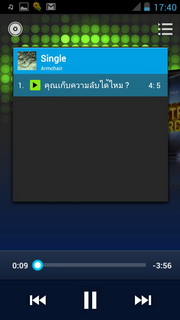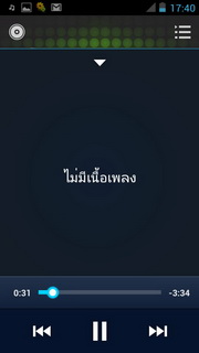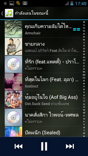 เมื่อเลือกเพลงแล้วจะแสดงเครื่องเล่นเพลงที่ประกอบไปด้วย ปุ่มย้อนไปรายการเพลงหน้าแรก, แสดงเพลงทั้งหมด, ปกอัลบั้ม (ถ้ามี), ชื่อศิลปิน/เพลง/อัลบั้ม เล่นสุ่ม, เล่นซ้ำ, แสดงเนื้อเพลง (ถ้ามี) แถบเวลาเพลง, เล่นก่อนหน้า, เล่น/พัก, เล่นถัดไป เมื่อกดตั้งค่าจะสามารถเลือกเพิ่มในรายการเพลง, แชร์เพลงออกสื่อต่างๆ, ลบเพลง, ดูข้อมูล, ตั้งค่า, ตั้งเป็นเสียงเรียกเข้า