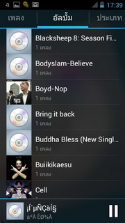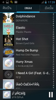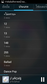 เครื่องเล่นเพลง และวิทยุ เมื่อเข้าเครื่องเล่นเพลงจะแบ่งรายการออกเป็น รายการเพลง, ศิลปิน, เพลง, อัลบั้ม, ประเภท, โฟลเดอร์