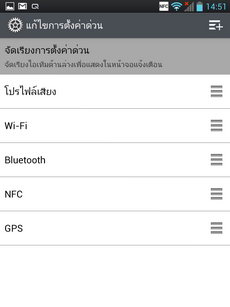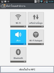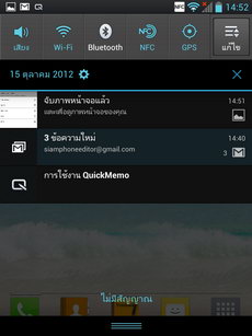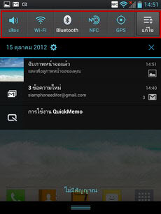 สามารถเลื่อนแถบสถานะการใช้งานลงมาด้านล่าง จะพบกับหน้าต่างการแจ้งเตือนพร้อมไอคอนเปิด-ปิดสถานะการเชื่อมต่อและฮาร์ดแวร์ของเครื่อง (เสียง, หน้าจอ) สามารถกำหนดตำแหน่งหรือใส่ไอคอนเพิ่มเติม