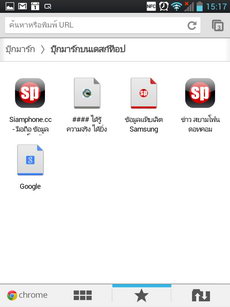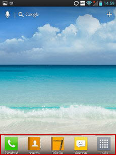 - ส่วนล่าง เป็นพื้นที่วางไอคอนหลัก มีทั้งหมด 5 ไอคอน สามารถใช้งานได้คล้ายกับไอคอนปกติ แต่จะแสดงผลเหมือนกันในหน้าจอหลักทุกหน้า