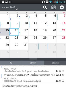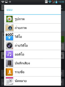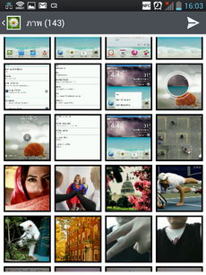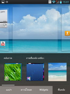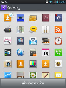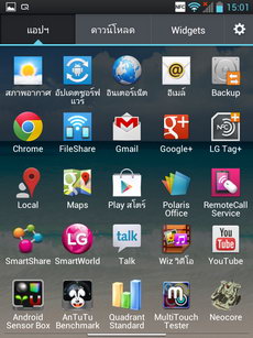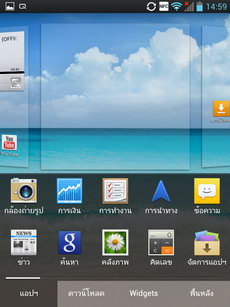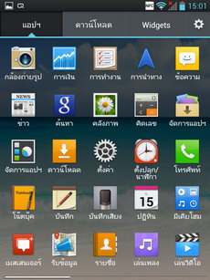 หน้าแอพพลิเคชั่น เข้าสู่หน้าแอพพลิเคชั่นโดยการแตะไอคอนรูปสี่เหลี่ยมหน้าลูกเต๋า (มุมขวาล่าง) ภายในหน้าแอพพลิเคชั่นจะรวมไอคอนและ widget ของแอพพลิเคชั่นทั้งหมดที่มีอยู่ในเครื่อง แสดงผลในรูปแบบตาราง (ปรับค่ารูปแบบการแสดงผลได้ที่ปุ่มเมนู>แสดงไอคอนขนาดเล็ก) สามารถเลื่อนไปทางซ้าย-ขวาเพื่อดูหน้าแอพพลิเคชั่นอื่น หรือหากต้องการนำไปวางไว้ที่หน้าจอหลัก ให้แตะไอคอนนั้นค้างไว้