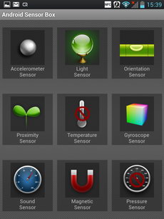 ทดสอบเซนเซอร์ด้วยโปรแกรม Android Sensor Box พบเซนเซอร์ดังนี้ - Accelerometer Sensor ตรวจวัดความเร็วเชิงมุม