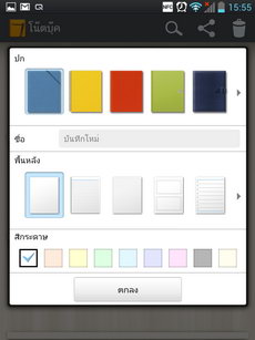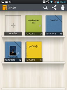 โน๊ตบุ๊ค เป็นแอพฯ ที่รวมไฟล์บันทึกที่ได้จาก QuickMemo มาเก็บไว้ สามารถสร้างบันทึกใหม่โดยเลือกแบบปก, ชื่อบันทึก, พื้นหลัง, สีกระดาษได้หลายรูปแบบ
