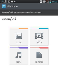 Fileshare แอพฯ สำหรับแบ่งปันไฟล์ข้อมูลร่วมกับอุปกรณ์ภายนอก ผ่าน Wi-Fi Direct สามารถแชร์ได้ทั้งไฟล์ภาพ, วิดีโอ, เพลง, และไฟล์เอกสาร