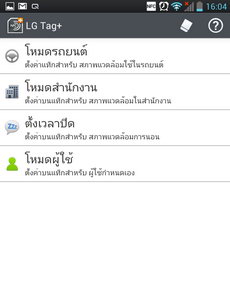 LG Tag+ แอพฯ สำหรับใช้งานเทคโนโลยี NFC ร่วมกับแผ่น LG Tag+ สามารถตั้งค่าระบบในโหมดต่างๆ ให้เปิดใช้งานตามที่ผู้ใช้กำหนด เช่น โหมดรถยนต์, โหมดสำนักงาน, ตั้งเวลาปิด, โหมดผู้ใช้