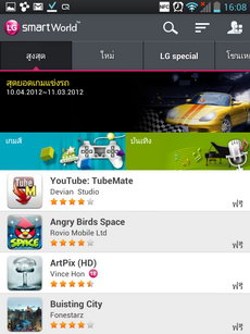 SmartWorld แหล่งรวมแอพพลิเคชั่นที่ LG แนะนำ แบ่งหมวดหมู่ออกเป็น แอพฯ ที่ได้รับความนิยมสูงสุด, แอพพลิเคชั่นใหม่, แอพพลิเคชั่น LG Special, โซนเหตุการณ์ และเด่น