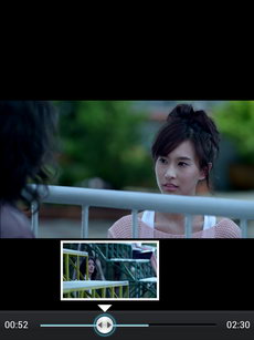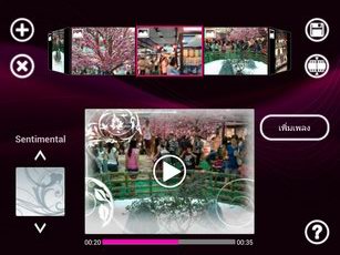 ด้านบนมีไอคอนปรับความเร็ววิดีโอ (0.5, 0.8, 1, 1.2 1.5, 2X), ไอคอนแสดงภาพตัวอย่างในแถบปรับเวลา (เฟรมพรีวิว), ไอคอนล็อคหน้าจอ, ไอคอนแสดงหน้าต่างรายการวิดีโอ สามารถเปิดเล่นคลิปวิดีโอในรายการด้วยเฟรมขนาดเล็ก, จีบนิ้วบนหน้าจอเพื่อซูมเนื้อหาในคลิปวิดีโอ