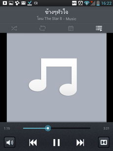 ในหน้าเครื่องเล่นเพลง ด้านบนมีไอคอนสลับเพลง, เล่นซ้ำ, ดูเนื้อเพลง, ไปยังหน้ารายการเพลง ด้านล่างมีไอคอนเล่น/หยุดเพลง, ย้อนกลับ, ข้าม, แถบเวลาเล่นเพลง, หน้าปกเพลง, ชื่อเพลง, ชื่อศิลปิน