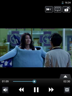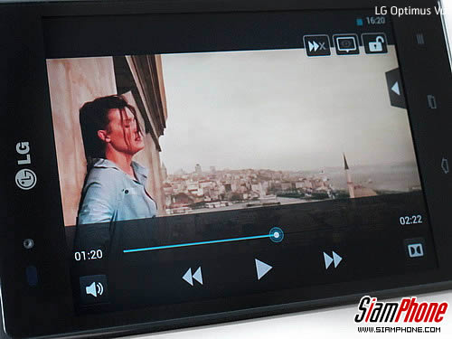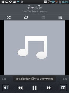 ในเครื่องเล่นวิดีโอ มีปุ่มเล่น, ย้อนกลับ, ข้าม, แถบเวลาเล่นวิดีโอ สามารถเลื่อนไปช่วงเวลาที่ต้องการ, ไอคอนเปิดใช้งานระบบเสียง Dolby Mobile