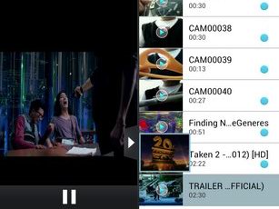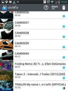 เครื่องเล่นวิดีโอ จัดเรียงไฟล์วิดีโอในรูปแบบรายการ มีไอคอนแนะนำฟีเจอร์ใหม่, ไอคอนเล่นไฟล์วิดีโอ DiVx, ไอคอนถังขยะสำหรับลบคลิปวิดีโอ