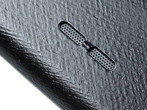 ด้านล่าง มีช่องไมโครโฟนอยู่กึ่งกลาง ที่มุมขอบทั้งสองด้านมีน็อตยึดตัวเครื่อง