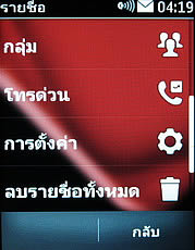 รายชื่อ - จัดการรายชื่อผู้ติดต่อ ดูรายชื่อ, เพิ่มใหม่, บันทึกการโทร, ซิงค์ทั้งหมด, กลุ่ม, โทรด่วน, การตั้งค่า, ลบรายชื่อทั้งหมด, ย้ายรายชื่อ, คัดลอกรายชื่อ