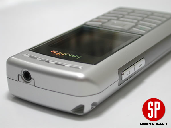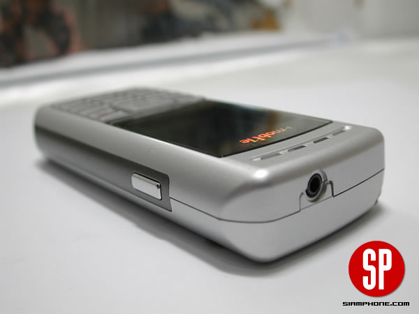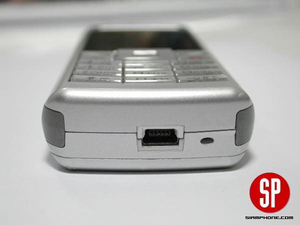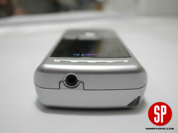 สำหรับช่องกลม ๆ เล็ก ๆ คือ แจ็คสำหรับเสียบชุด Smalltalk และหูฟัง MP3 สำหรับท่านที่ต้องการฟังเพลงแบบส่วนตัว นอกเหนือจากการฟังผ่านทางลำโพงด้านหลังของเครื่อง (สามารถใช้งานกับชุดหูฟังวิทยุทั่วไปได้) ส่วนที่มุมขวาของเครื่องจะเป็นช่องสำหรับร้อยสายคล้องคอ (แต่ตอนนี้หากใครจะคล้องคอล่ะก็ ระวังพวกมิจฉาชีพไว้บ้างก็ดีครับ) สำหรับด้านล่างสุด คือ ช่องเสียบสายชาร์จ ซึ่งในส่วนนี้ สามารถใช้งานร่วมกับสายดาต้าลิงค์ (มีให้มาในกล่อง) เพื่อเชื่อมต่อแลกเปลี่ยนข้อมูลระหว่างคอมพิวเตอร์กับโทรศัพท์ ส่งเพลง และยังสามารถใช้ได้กับสายดาต้าของกล้องดิจิตอลได้ด้วยครับ