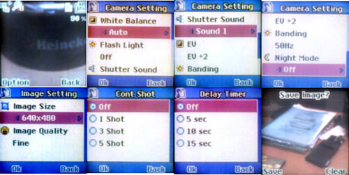 - Camera with Flash สามารถถ่ายภาพในระดับ VGA ขนาด 640x480 พิกเซล และลดลงได้อีก 3 ระดับ : 320 x240, 160x120 และ 80x60 พิกเซล ในรูปแบบ .JPG พร้อมซูมภาพแบบดิจิตอล 2 ระดับ, เลือกคุณภาพ 4 แบบ, ปรับ WB หรือ white balance แบบอัตโนมัติ, และปรับตั้งเองได้ 3 แบบ : แสงกลางวัน, แสงหลอดไฟ และ ฟลูออเรสเซนต์ มีไนท์โหมดช่วยถ่ายภาพในที่มืด เลือกปิดเสียงหรือแบบเสียงชัตเตอร์ 3 เสียง ปรับชดเชยแสงได้ตั้งแต่ EV -4 จนถึง EV +4 ถ่ายภาพต่อเนื่องได้ตั้งแต่ 1-5 รูป ตั้งเวลาถ่ายภาพได้ตั้งแต่ 5-15 วินาที และสุดท้ายสมารถเลือกเก็บภาพได้ทั้งในหน่วยความจำของตัวเครื่องหรือการ์ดความจำภายนอกได้