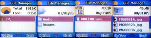 - File manager ความสามารถพิเศษที่น่าสนใจอีกส่วนคงเป็นในเรื่องของการจัดการข้อมูล ซึ่งเมื่อพิจารณาดูแล้ว มือถือที่มีฟังก์ชั่นนี้อยู่ยังมีจำนวนน้อย โดยเลือกจัดการไฟล์ได้จากตัวเครื่องและการ์ดความจำ สำหรับหน่วยความจำของตัวเครื่องที่แสดงให้เห็นมีทั้งหมด 2 mb ด้วยกัน ซึ่งโฟลเดอร์หลักๆ แบ่งออกเป็น 2 โฟลเดอร์ ได้แก่ โฟลเดอร์ Audio สำหรับจัดเก็บไฟล์เพลง MP3 หรือไฟล์ WAV ที่ได้จากการอัดด้วยฟังก์ชั่น Sound recorder และโฟลเดอร์ Image สำหรับใช้จัดเก็บภาพถ่ายจากกล้องถ่ายรูปที่ติดตั้งในตัวเครื่อง หรือภาพที่นำเข้ามาจากภายนอกผ่านทางสายดาต้าเคเบิ้ล
