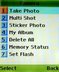 5. Camera : กล้องดิจิตอล 300,000 พิกเซล (VGA Camera) กำหนดขนาดได้ 3 แบบ ( 640*480 , 320*240 และ 160*120 พิกเซล) ซูมภาพดิจิตอล 4 เท่า (4x digital zoom) กำหนดเสียงชัตเตอร์ 3 เสียง ฟังก์ชันการถ่ายภาพต่อเนื่อง (multi-shot) กรอบสติ๊กเกอร์ 9 แบบ นอกจากนั้นหากสภาวะแสงไม่เพียงพอก็จะมีแฟลชช่วยสำหรับถ่ายภาพในที่มืด สามารถเก็บภาพได้สูงสุด 40-50 ใบ (800 KB)