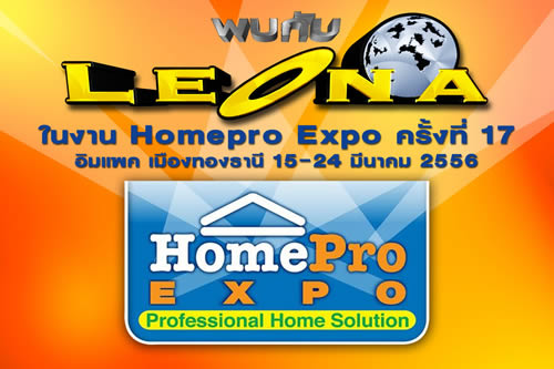 Leona นำทีมประชาสัมพันธ์พิเศษ ร่วมงาน “HomePro EXPO” ครั้งที่ 17 มหกรรมการแสดง และจำหน่ายสินค้าเกี่ยวกับบ้านครั้งยิ่งใหญ่แห่งปี 2556 โดยงานนี้ Leona เตรียมขนสินค้า เครื่องเสียง Home Theater และ DVD อีกหลากหลายรุ่น มาลดราคาพิเศษในงาน โดยงานจัดระหว่างวันที่ 15-24 มีนาคม 2556 ณ อิมแพ็คเมืองทองธานี ฮอลล์ 5-8 ดูรายละเอียดเพิ่มเติมที่ www.leonathai.com