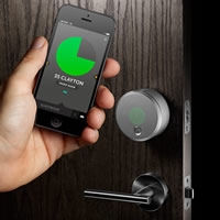 August Smart Lock กุญแจล๊อคบ้าน ที่ไม่จำเป็นต้องใช้กุญแจ คีย์การ์ด หรือรหัสผ่านใดๆ ซึ่งการทำงานของเจ้าตัวกุญแจตัวนี้ คือ ทำงานร่วมกับสมาร์ทโฟน หรือโน็คบุ๊คผ่านสัญญาณบูลทูธ โดยรับคำสั่งให้ล็อค หรือปลดล็อคจากสมาร์ทโฟนของคุณเอง