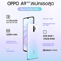 เปิดตัวสีใหม่ล่าสุด “OPPO A9 2020 Vanilla Mint” วางจำหน่ายแล้ว ในราคา 8,990 บาท สเปคแรง แบตอึด กับดีไซน์และสีที่ได้แรงบันดาลใจจากแสงแดดในยามบ่ายอันเงียบสงบ รวมทั้งยังนำเทคโนโลยีสีในระดับนาโนมาใช้ในดีไซน์ด้วยการไล่เฉดสีจากสีขาวไปจนถึงสีฟ้าอมเขียวราวกับน้ำทะเล สวยสะกดทุกสายตา