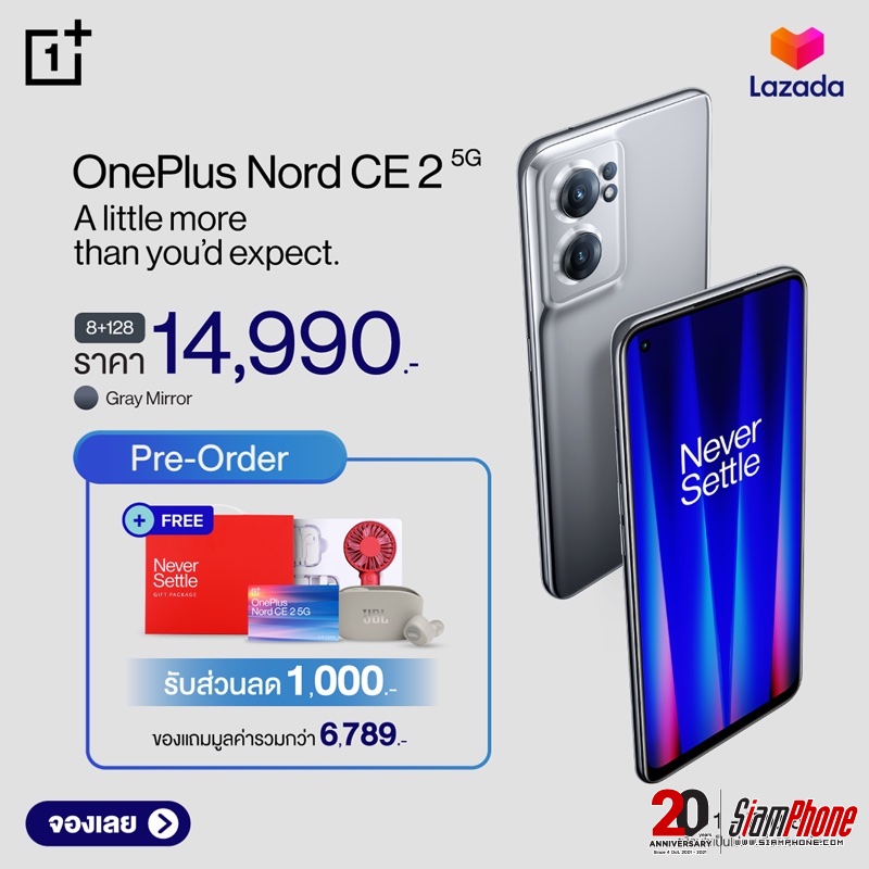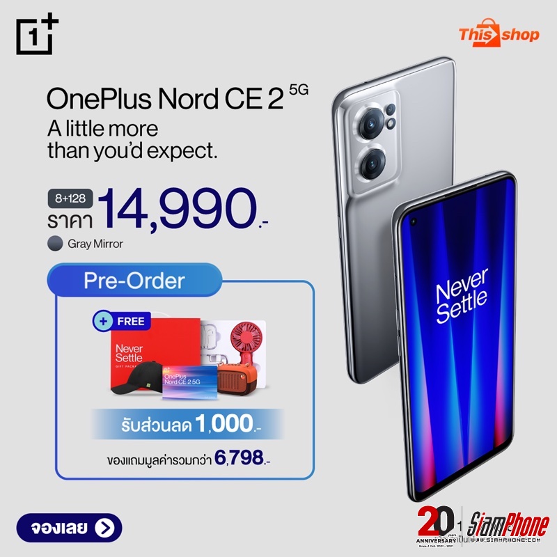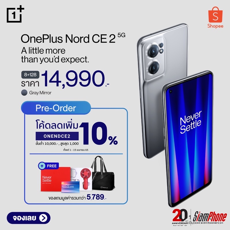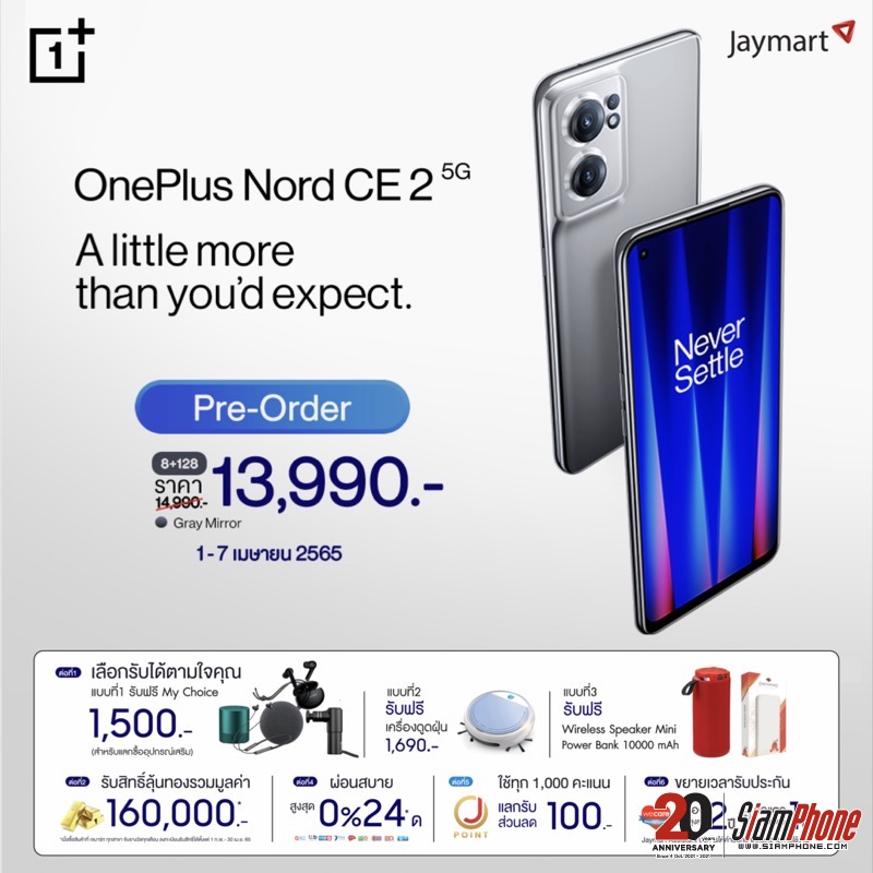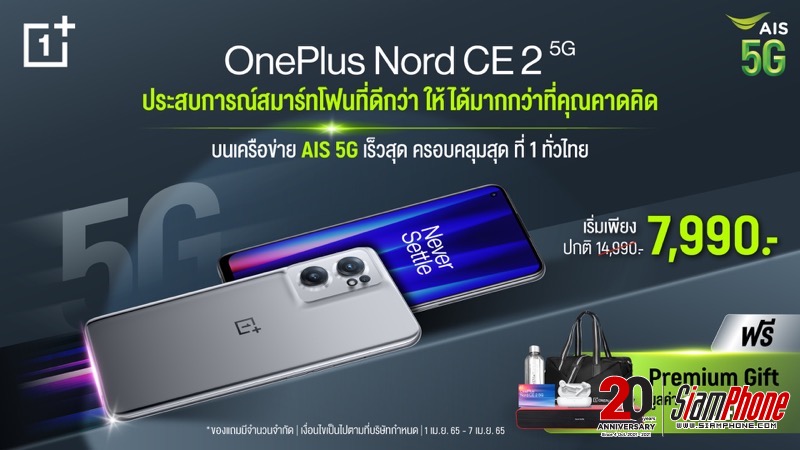 และพิเศษ!! โปรโมชั่นเมื่อสั่งซื้อผ่านช่องทางผู้ให้บริการเครือข่ายอย่าง AIS พร้อมแพ็คเกจรายเดือน Hot Deal 5G Max Speed Exclusive เฉพาะช่องทาง AIS ในราคาเริ่มต้น 7,990 บาท พร้อมของพรีเมี่ยมมูลค่าถึง 10,469 บาท พิเศษเฉพาะช่วง pre-order ตั้งแต่วันที่ 1 – 7 เมษายน 2565 นี้ รายละเอียดเพิ่มเติม https://www.ais.th/oneplus/nord-ce-2-5g
