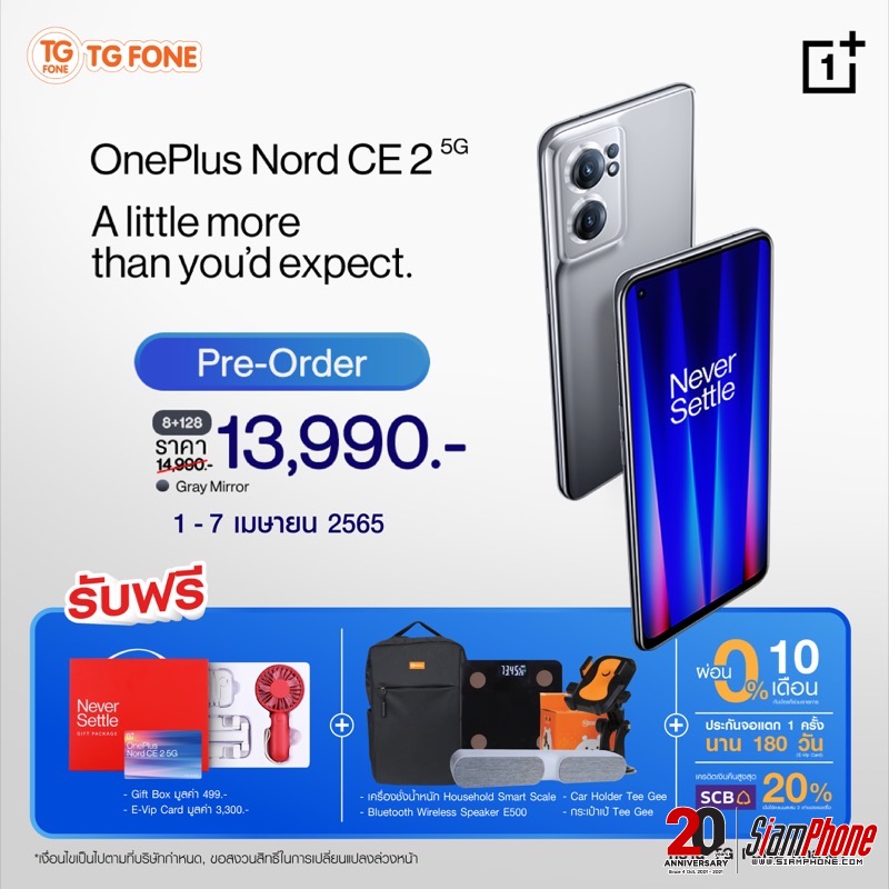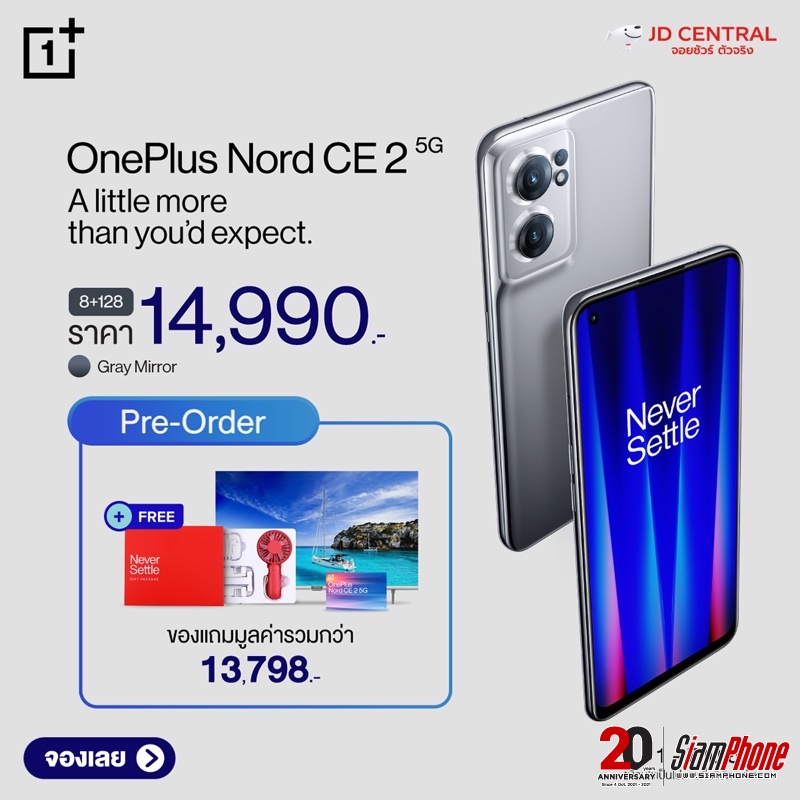 OnePlus Nord CE 2 5G เริ่มวางจำหน่ายอย่างเป็นทางการในวันที่ 8 เมษายน 2565 และพิเศษหากสั่งซื้อ พรีออร์เดอร์ตั้งแต่วันนี้ – 7 เมษายน 2565 พร้อมรับของสมนาคุณ รวมมูลค่า 3,300 บาท รับบัตรประกันจอแตก พร้อมของแถมอื่น ๆ อีกมากมาย