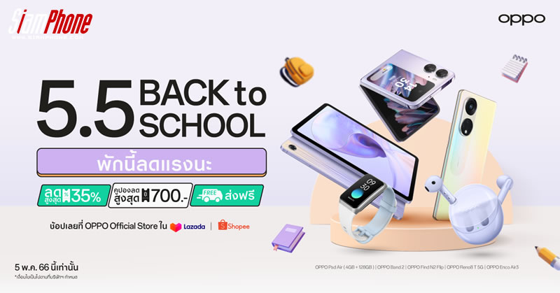 OPPO ต้อนรับเปิดเทอมใหม่ มอบส่วนลด โปรแรงผ่านแคมเปญ “OPPO 5.5 Back to school” จัดเต็มส่วนลดสมาร์ทโฟนและอุปกรณ์ IoT สูงสุด 35% และคูปองลดสูงสุด 700 บาท เริ่มวันที่ 5 พฤษภาคม 2566 นี้ ที่ OPPO Official Store บน Shopee และ Lazada