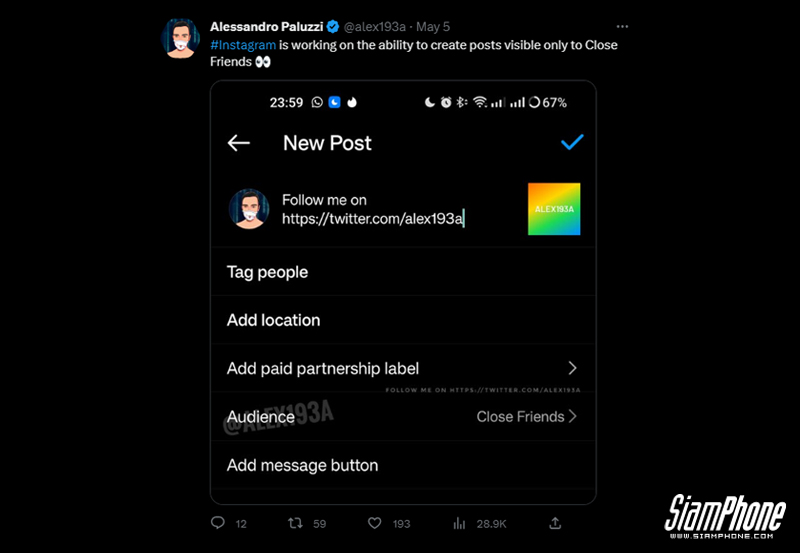 จากข้อมูลบนทวิตเตอร์ของนักพัฒนามือถือ Alessandro Paluzzi (ผ่าน BGR) ซึ่งได้รับการยืนยัน blue-check บน Twitter และ Instagram ได้ทวิตเตอร์ถึงฟีเจอร์ใหม่ที่อาจมีขึ้นในอนาคต รวมถึงมีภาพถ่ายหน้าจอที่เผยให้เห็นตัวเลือกใหม่บนหน้า New Post โดยในการตั้งค่านั้นจะมีแท็บ "Audience" เพิ่มเข้ามาและผู้ใช้สามารถเลือกได้ว่าต้องการให้ทุกคนเห็นโพสต์หรือแค่ใน Close Friends เท่านั้น ฟีเจอร์ดังกล่าวกําลังถูกทดสอบบน Instagram ในตอนนี้ และยังไม่ชัดเจนว่าฟีเจอร์นี้จะพร้อมเปิดให้ใช้งานเมื่อใด