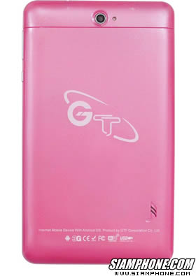 GT T1 แท็บเล็ตแอนดรอยด์ สีสันสดใส มีหน้าจอแสดงผลขนาด 7 นิ้ว ใช้หน่วยประมวลผล Dual-Core ความเร็ว 1.3 GHz ติดตั้งกล้องถ่ายรูปหน้า-หลัง ความละเอียด VGA หน่วยความจำภายในขนาด 4 GB รองรับการ์ด microSD ได้สูงสุด 32 GB, สามารถใช้โทรศัพท์ได้ รองรับใช้งาน 2 ซิมการ์ด และเชื่อมต่อเครือข่าย 3G บนคลื่นความถี่ 2100 MHz, แบตเตอรี่ความจุ 2500mAh