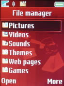 File Manager - โปรแกรมจัดการไฟล์ ที่ถูกจัดแบ่งออกเป็นหมวดหมู่ไว้อย่างชัดเจน ไม่ว่าจะเป็นรูปภาพ เพลง คลิปวีดีโอฯ ซึ่งใช้จัดการได้ทั้งไฟล์ที่อยู่ในตัวเครื่องและที่บันทึกอยุ่ในการ์ดความจำ ผู้ใช้สามารถส่งไฟล์เหล่านี้ผ่านไปยังผู้อื่นผ่านทาง MMS (สำหรับไฟล์ภาพ เสียง และคลิปวีดีโอ) E-mail, Bluetooth และ IrDA หรือจะเคลื่อนย้ายไปเก็บไว้ในโฟลเดอร์อื่น คัดลอกหรือย้ายไปเก็บไว้ในการ์ดความจำเพื่อประหยัดพื้นที่ในตัวเครื่อง