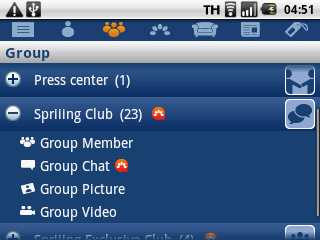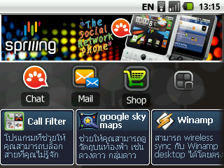 ตรวจสอบคุณสมบัติจากเครื่องจริง Spriiing Smile ใช้แอนดรอยด์เวอร์ชั่น 2.1-update1 ตัวเครื่องผลิตโดย Huawei (Smile U8300) โดยใช้ CPU ARMv6-compatible rev 2 (v6l) ความเร็ว 600MHz RAM 179MB ROM 190MB จอแสดงผลที่ความละเอียด 320 x 240 พิกเซลในแนวนอน จำนวนจุดต่อตารางนิ้ว 120 dpi เซนเซอร์ที่ติดตั้งมาในตัวเครื่องมี 6 ตัวด้วยกันคือ Accelerometer, Compass, Magnetic field, Proximity, Light และ Temperature Spriiing แอพพลิเคชั่น บริการพิเศษจาก Spriiing ประกอบด้วยแถบให้บริการ 7 แถบ