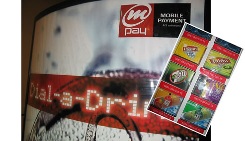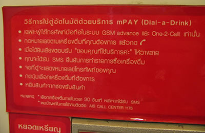 ตอนนี้ก็มีร้านค้าและบริการต่าง ๆ ตาม Internet ที่เปิดให้บริการชำระเงินทาง mPay มากมาย สังเกตง่าย ๆ คือจะมี Sticker คำว่า mPay สีแดงสดใสติดอยู่ อย่างตู้น้ำตามห้างสรรพสินค้าที่ผมกำลังจะพาไปกดนี่ก็จะเห็นสีแดงเด่นมาแต่ไกล พร้อม Slogan เข้าท่าว่า Dial a Drink [ โทรสั่งเครื่องดื่ม ] ติดเอาไว้ด้วย