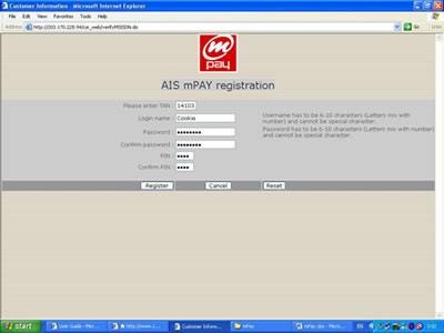 เข้าไปที่ http://mpay.ais.co.th ด้วย Computer เลือกรายการ mPAY > Registration ใส่เลขหมายที่ต้องการลงทะเบียน ระบบจะส่ง SMS ยืนยันการลงทะเบียนพร้อมรหัส TAN มายังโทรศัพท์เรา ให้เรานำเลข TAN นั้นป้อนลงในช่องลงทะเบียนต่อพร้อมกำหนดชื่อ Username/PIN ที่เราต้องการ ก็เป็นอันจบ