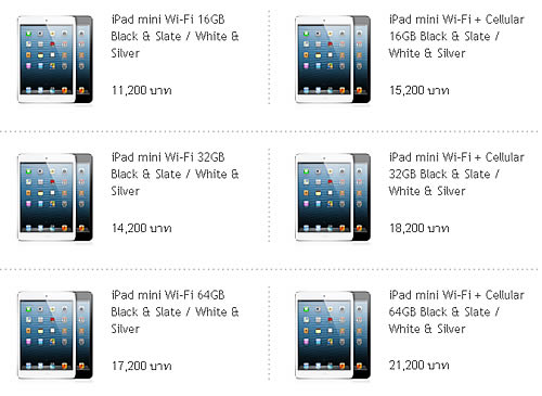 สำหรับ iPad mini ที่จะวางจำหน่ายในร้าน iStudio by copperwired จะเป็นตัวที่รองรับ Wi-Fi ก่อนในเบื้องต้น โดยสินค้าจะวางจำหน่ายในราคาดังต่อไปนี้